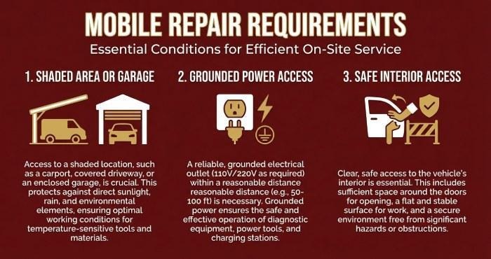 - Quality mobile providers are insured, background-checked, and transparent. If anything feels rushed or tools seem improvised, consider directing the vehicle to a controlled repair shop environment instead.