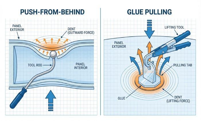 How Paintless Dent Repair Works: Tools, Techniques, and Materials (Glue Pulling vs. Push-from-Behind)